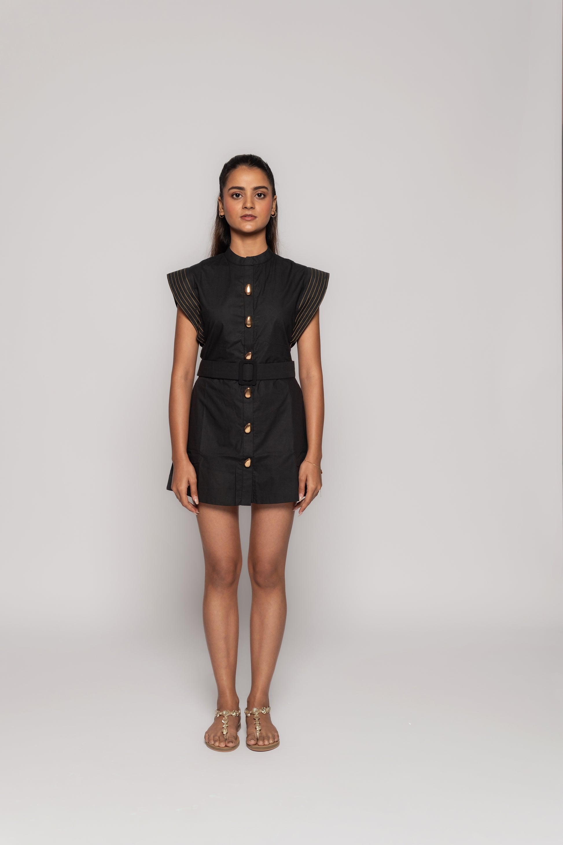 Introducing the Inez Poplin Mini Dress in Black Beauty from our 2025 Collection, Refined Elegance. A structured bodice cotton dress featuring a waist belt, this sleeveless silhouette offers sculptural definition. A versatile piece with front buttons down the centre, adorned with gold droplet embellishments, adds an elevated finish to this statement piece.
